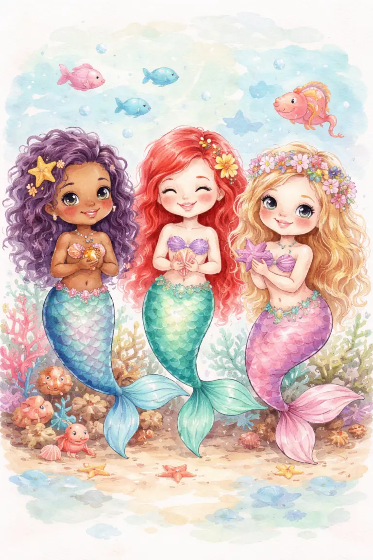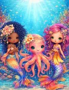 Sparkle Lagoon captures a bright, playful style filled with magic, movement, and under-the-sea wonder. Shimmering teals, soft aquas, gentle purples, and touches of pink create a lively underwater world that feels cheerful, imaginative, and full of fun.